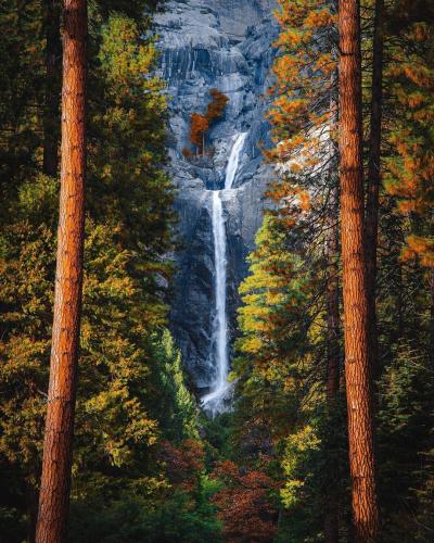 Lower Yosemite waterfalls in a tree frame (photo @jguzmannn)