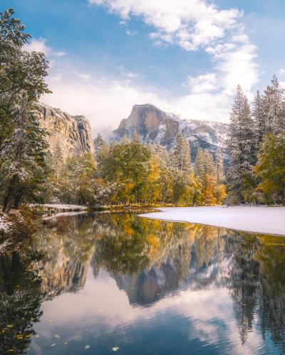 Rare glimpse of Half Dome with fall colors and snow. Yosemite National Park, California